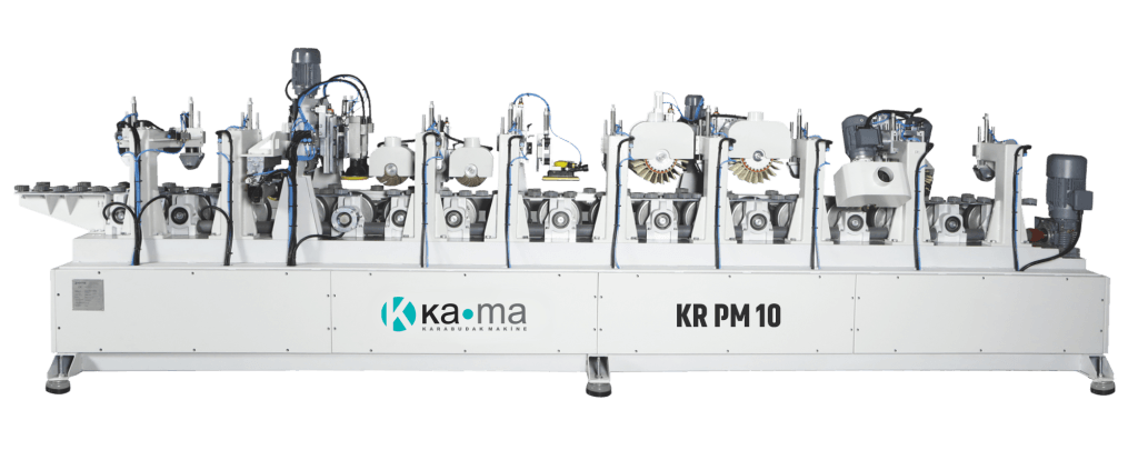 KR PM 10, a sanding machine designed for raw and primed surfaces of door frames, moldings and baseboards, recognizes the starting and ending points of part printing. KR PM 10 profile sanding machine, consisting of oscillating orbital edge sander, oscillating orbital surface sander, rectangular vibratory sander, oscillating cylindrical brush sander, fixed cylindrical brush, mop sander and control system, is the machine with the highest edge surface processing ability among the oscillating sanding machines. It is suitable for use in casings, moldings, skirting boards, crowns and all other types of edge wooden profiles.